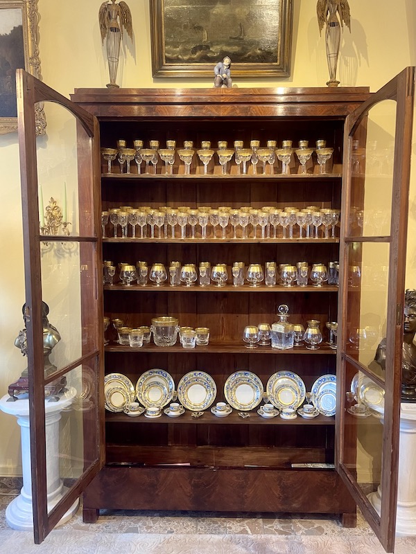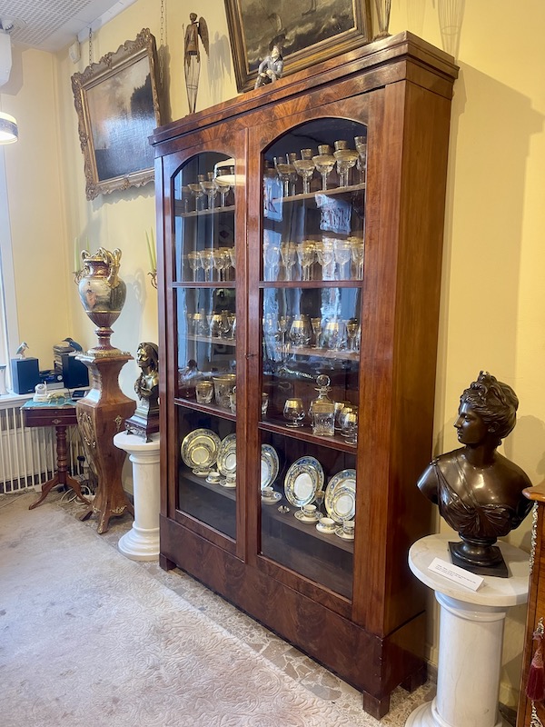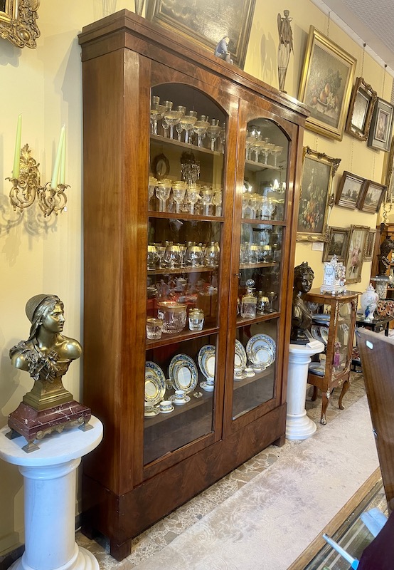 großer Biedermeier-Bücherschrank um 1820 Mahagoni fundiert – hochrechteckiger Korpus mit getreppten Aufsatz – in der gegliederten Front, zwei schmale Vitrienentüren, mit Original Glas – unrestauriert mit kleinen Gebrauchsspuren – zerlegbar -Höhe: 2,32 m, Breite: 1,55 m, Tiefe: 0,30 m