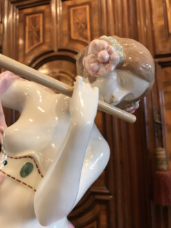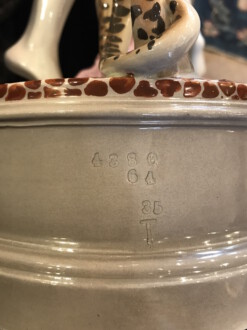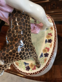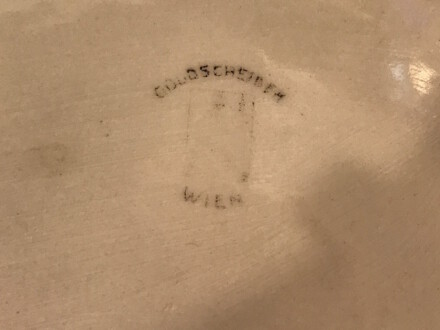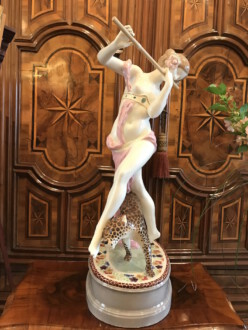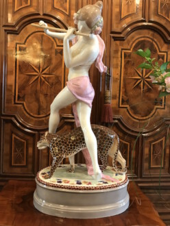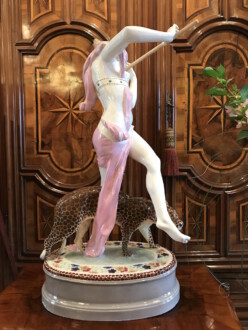 Tänzerin mit Leopard – Entwurf: Podola ( Stanislaus Czapek ) ca.1913 – Ausführung: Wiener Manufaktur Friedrich Goldscheider, ca. 1922-25 – Keramik, farbig staffiert – auf der Rückseite des ovalen Sockels eingeprägte Modellnummern, Unterseite mit Marke und schwarzen Firmenstempel – Höhe: 60,5 cm