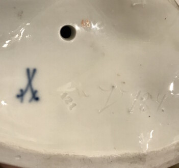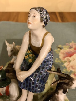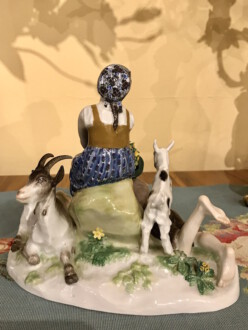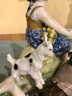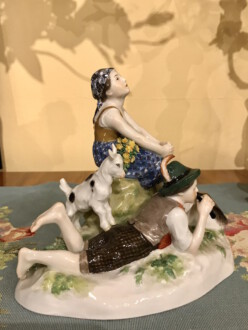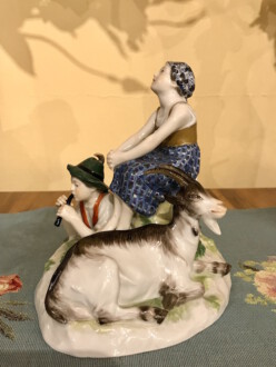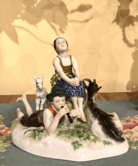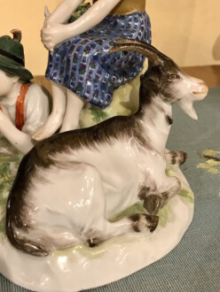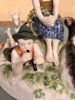 Meissengruppe ,, Der Frühling ,, – auf reliefplastisch gearbeiteten Sockel ein musizierender Hirtenjunge mit Hirtenmädchen, Zicklein und Ziege – Unterglasurblaue Schwertmarke, eingeritzte Modelnummer „V 124“ – Modell von Erich Hösel – Modelljahr: 1905-1910 – Modellnummer.: V 124 – Höhe: 17 cm, Breite: 21,5 cm