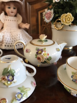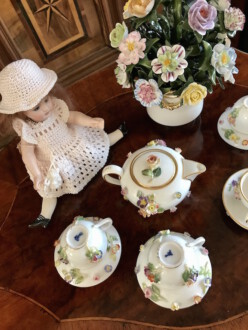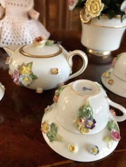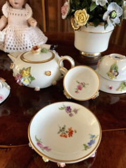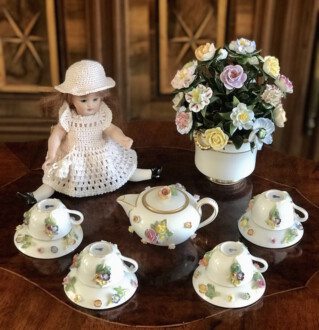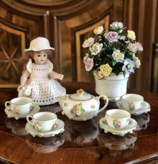 4 Miniaturtassen/Puppentassen, außen mit plastisch aufgesetzten Blüten, innen mit Streublümchen dekoriert – 1 Miniaturteekännchen mit plastisch aufgersetzten Blüten – Meissen ca. 1880 – geknaufte Schwertermarke unter Glasur – Tasse: Höhe 2,7 cm, Durchmesser 4,3 cm – Untertasse: Durchmesser 6,5 cm – Teekanne: Höhe. 4,8 cm ( ohne Rose ) Durchmesser 7 cm
