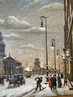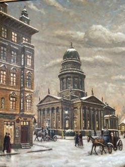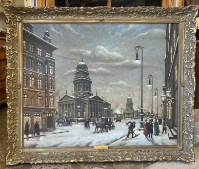 Gemälde Öl auf Leinwand – winterliche Szene auf dem Berliner Gendarmenmarkt – Blick von der Markgrafentraße, Ecke Mohrenstraße – Waldemar Sewohl, ( Wismar 1887 – 1967 Berlin ) – links unten sign. W. Sewohl – Größe: 1,19 m X 0,99 m, Rahmenbreite: 10 cm