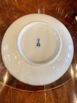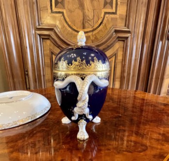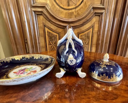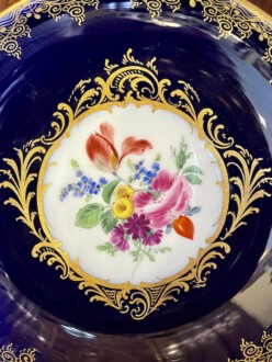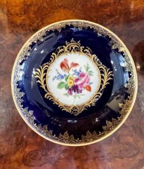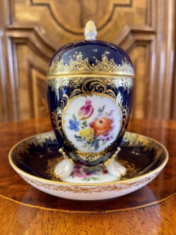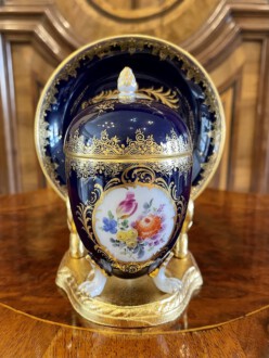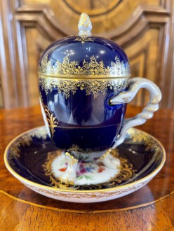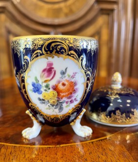 Meissen Deckeltasse mit Untertasse auf 3 Tatzenfüssen mit Schlangenhenkel – kobaltblauer Fond – Schauseite mit rocaillengerahmter Kartusche, darin Blütenbuketts, rundum reiche Goldspitze – Untertasse als tiefe Schale in identischer Gestaltung, Goldbordüre auch unterhalb der Untertasse – Deckel mit Goldspitze und Pinienknauf – Tasse: Höhe: 12 cm, Durchmesser 6,8 cm, Untertasse: Höhe 3 cm, Durchmesser 13 cm – geknaufte Schwertermarke, 1. Wahl – Meissen ca. 1880